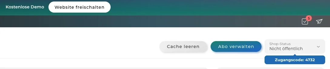 Voraussetzung für das Golive ist, dass ein Abo abgeschlossen ist. Durch Klick auf "Website/Shop freischalten" in der oberen Leiste oder in den Einstellungen mit Klick auf "Abo verwalten" gelangst du zur Bestellung deines passenden Abo-Pakets.